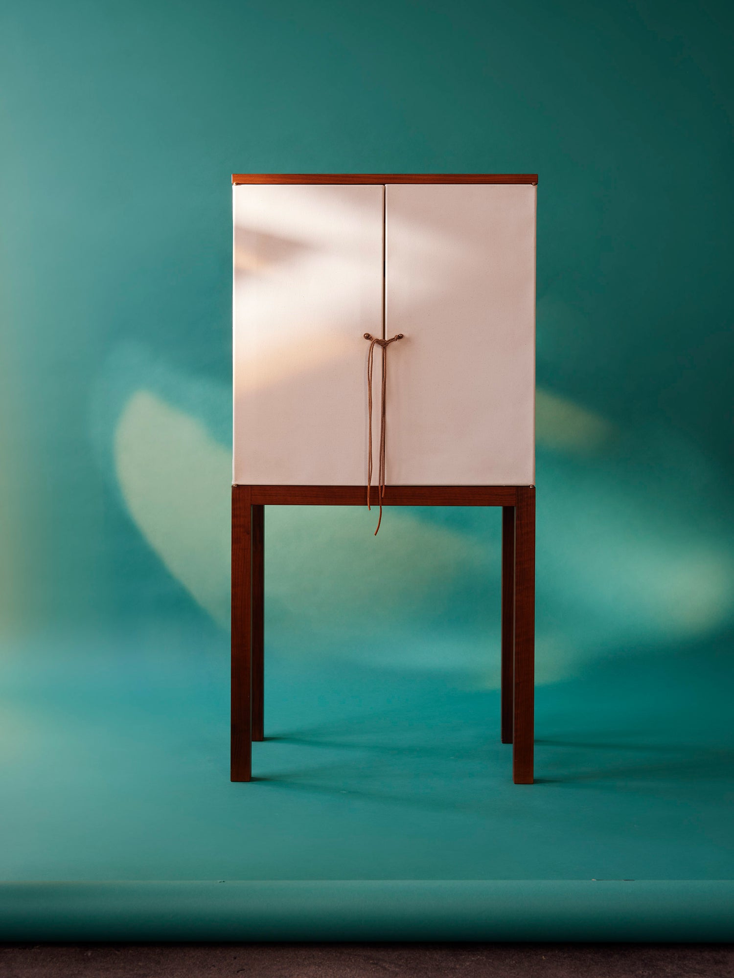 An experimental project at its inception, CANVAS CABINET is a design piece with elegant proportions on tall legs, informed by textile properties and its Swedish heritage. Originally designed as a home office, Canvas Cabinet hides its content behind slightly translucent fabric doors.