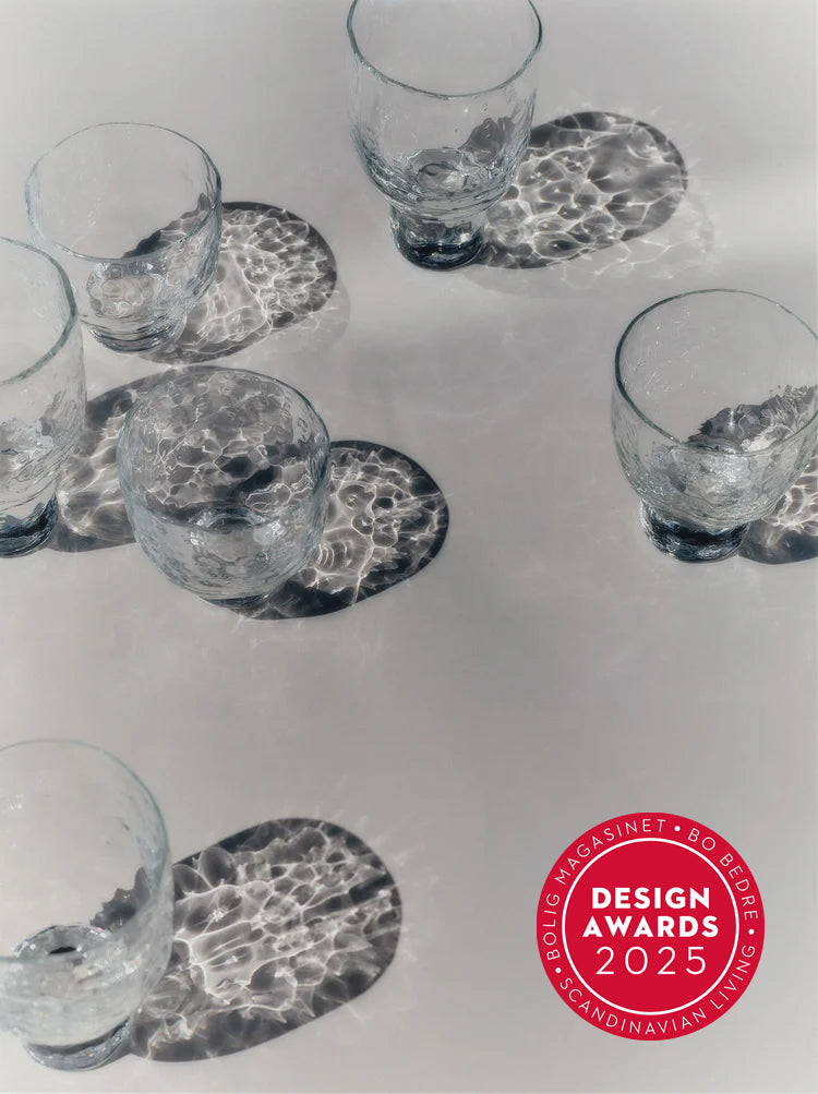 Made by hand at a small Swedish glasswork with 100% recycled glass, the design use material thickness and asymmetric shapes, as well as the manufacturing process to bring out the blurry properties of glass.